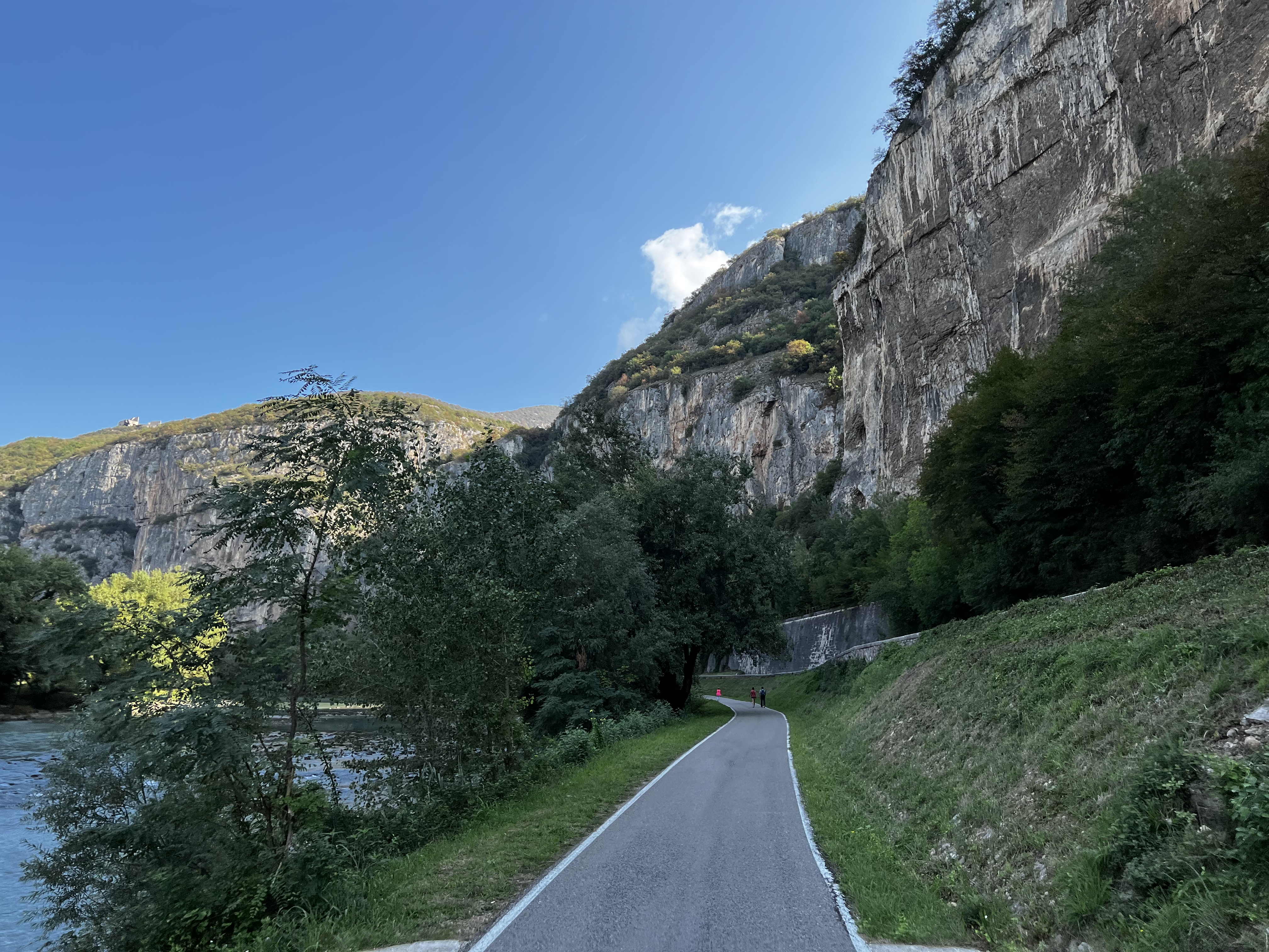 Proseguiamo fra sali scendi sempre su sede asfaltata e poco dopo il canyon si apre nei pressi delle anse del fiume adige da dove cominiciano i vigneti che insieme all'adige ed i forti della grande guerra caratterizzano gran parte del percoso iniziale. Proprio qui alzando lo sguardo si posso osservare i resti, alcuni ben tenuti della rete di forti austriaci e italiani che controllavano tutta la zona in particolare Forte Wohlgemuth sul lato del Monte Baldo a sinistra oltre il fiume Adige ed il Forte Molinary sulla destra nei monti della Val Pollicella.